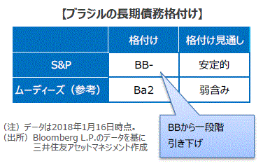 ■米格付け大手S&Pグローバルは11日、ブラジルの長期債務格付けを「BB」から「BB-」へ、1段階引き下げました。また、格付けの見通しを、「弱含み」から「安定的」に変更しました。S&Pは格下げの理由として、ブラジルの財政改革の遅れと18年の大統領選挙後の政策の不確実性を挙げています。