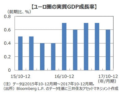 ■2017年10-12月期のユーロ圏の実質GDP成長率(速報値)は前期比+0.6%、前年同期比+2.7%となりました。ユーロ圏経済は、1%台前半と見られる潜在成長率を上回る拡大が続いています。