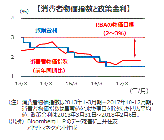 ■一方、インフレは直近2017年10-12月期で前年同期比+1.8%と、依然としてRBAの目標値の下限である+2%を下回っています。しかし、RBAは「景気の拡大に伴い、インフレは2018年中に目標レンジに到達する」との見方を据え置きました。