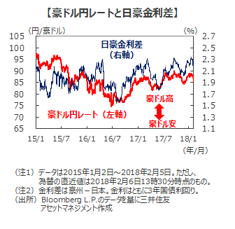 ■足元の豪ドルの対円相場は、世界的な株安の影響によるリスク回避の動きの強まり等から軟調な展開となっています。当面は、神経質な動きが続くことが予想されます。