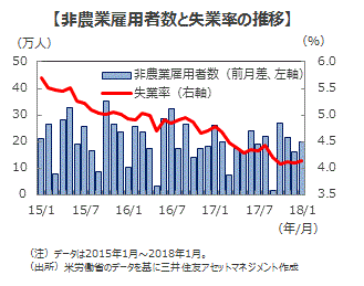 ■2018年1月の非農業雇用者数は、前月比20万人増、失業率は4.1%でした。米国の労働市場は、依然、好調です。