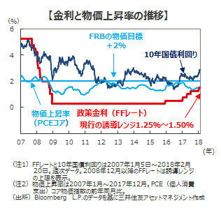 ■アトランタ地区連邦準備銀行が開発した経済モデルによれば、2月16日までに公表された経済指標をもとに推計した18年1-3月期の米実質GDP成長率は、前期比年率+3.2%でした。18年の米国経済は良好なスタートを切ったといえそうです。一方、物価は引き続き落ち着いています。1月の消費者物価のうち食品・エネルギーを除いたコア指数の上昇率は、前年同月比