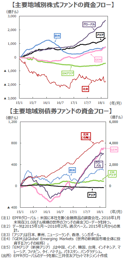 ■2月は米国の長期金利上昇をきっかけに、世界の株式市場が大きく調整しました。資金フローを見ると、株式ファンドは第1週に306億ドルの流出超となり、債券ファンドは第2週に141億ドルの流出超となりましたが、その後はいずれも流入に転じています。新興国からの資金流出も懸念されましたが、現在までのところ資金流入が続いています。2月の株式市場を中心とする金融市場の調整は、ファンド全体から資金を流出させるには至っていないようです。