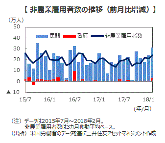 ■2018年2月の非農業部門雇用者数は前月比31.3万人の増加となり、市場予想(ブルームバーグ集計)の同20.5万人増を上回りました。3カ月移動平均で測った雇用の増加速度は24.2万人と、ここへきて再び勢いが増しています。