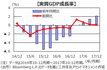 ■3月1日に発表された2017年10-12月期の実質GDPは前期比+0.1%と、個人消費の停滞から市場予想(ブルームバーグ集計+0.3%)を下回ったものの、4四半期続けてプラス成長となりました。この結果、2017年の実質GDPは前年比+1.0%と、3年ぶりのプラス成長に転換し、景気は緩やかな回復基調にあることが確認されました。