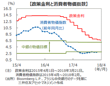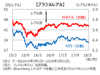 ■中銀の声明文によると、次回5月の金融政策委員会でも、0.25%の利下げが行われる見通しです。通貨レアルはこの先、神経質な展開となりそうです。これまでの金融緩和の効果などによりブラジル経済は回復しつつあり、この流れは今後も続くと見られます。一方、現大統領のテメル氏も汚職への関与が取りざたされている他、緊縮財政への国民の支持が低いこともあり、財政赤字改善に向けた年金改革は停滞しています。10月の大統領選に向けて政局の不透明感がレアルの向かい風となりそうです。