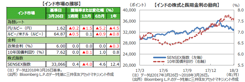 ■インド株式市場は、主要株価指数のSENSEXが年初来安値圏にあるなど、引き続き軟調な展開となっています。大手国営銀行を巡る巨額の不正取引の影響が尾を引いていることに加え、トランプ米政権が中国に対して「通商法301条」を発動すると表明し、貿易摩擦が高まることへの警戒感から投資家のリスク回避姿勢が強まり、世界的に株式市場が調整したことが背景です。