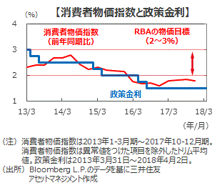 ■消費者物価上昇率は、RBAの目標値の下限である+2%を下回った状態が続いていますが、「景気の拡大に伴い、インフレは2018年にRBAの目標レンジに到達する」との見方を継続しました。