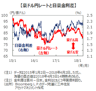 ■ただ、豪州の堅調な景気拡大、日本と豪州の金融政策の方向性の違い(日銀は金融緩和姿勢維持、RBAは据え置きの見通し)等を踏まえると、豪ドルは次第に落ち着きを取り戻すと見られます。