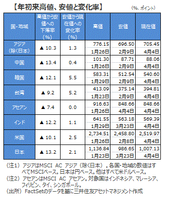 ■足元では、株式市場は概ね落ち着きつつあります。安値からの戻りを見るとアジア(除く日本)は+1.3%となっています。米国の同+2.5%や日本の同+2.1%に比べると、やや出遅れ感があります。これは、韓国、台湾市場が回復傾向を強めている一方、中国の戻りが相対的に小さく、アセアンが引き続き調整気味で推移しているためです。米中貿易摩擦が中国、そして中国がサプライチェーンを展開している東南アジア諸国の経済悪化懸念に結び付いているためと考えられます。