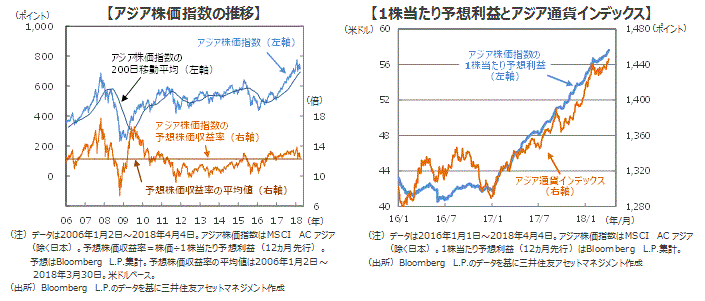 ■中国が業績をけん引し、上昇基調を支えると期待されます。アジア通貨インデックスは堅調に推移しており、資本流出のリスクは限定されそうです。予想株価収益率は2006年以来の平均値に回帰しており、割高感はありません。株価は200日線も割れておらず、株価の上昇モメンタムは続いていると考えられます。