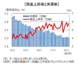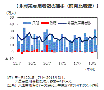 ■2018年3月の非農業部門雇用者数は前月比10.3万人の増加となり、市場予想(ブルームバーグ集計)の同18.5万人増を下回りました。