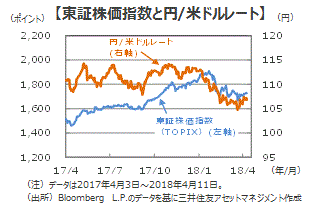 ■日本株式市場は、2月に米国金利の上昇、3月に米中貿易摩擦に対する懸念などを背景とした、米国株式市場の調整と米ドル安・円高の進行等から調整を余儀なくされました。4月に入ってからは、一進一退の展開ながら、下値を固める値動きとなっています。
