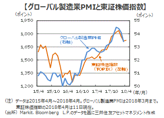 ■東証株価指数(TOPIX)は、世界の製造業の景況感を示すグローバル製造業PMIと高い連動性があります。2016年5月以降の株式市場の上昇は、世界経済の拡大と企業景況感の大幅上昇に沿ったものでした。しかし、グローバル製造業PMIはピークとなった2017年12月の54.5から3カ月連続で低下しています。2018年2月以降の日本株式市場の調整は、米国金利の上昇や米中貿易摩擦問題と共に、グローバルな景況感の鈍化の影響を受けていると見られます。