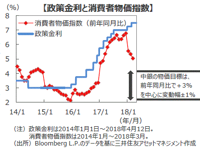 ■9日に発表された3月の消費者物価指数は前年同月比+5.04%となりました。中銀の物価目標レンジ(+2~4%)を依然上回っているものの、2017年12月の同+6.77%を直近のピークにして、物価上昇ペースは急速に鈍化しています。