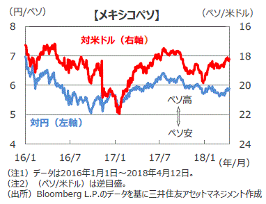 ■メキシコ経済はここ数カ月緩やかに拡大しています。懸念されていたインフレが今年に入り落ち着きを見せ始め、今後は中銀の目標付近に収まると見られているものの、北米自由貿易協定(NAFTA)を巡る米国との交渉や、今夏予定される大統領選挙などの不透明要因があることから、中銀は当面様子見を続けると見られます。