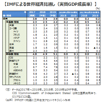 ■4月17日に発表された国際通貨基金(IMF)の世界経済見通しによれば、2018年、19年共に3.9%と、18年1月の見通しを据え置きました。内訳を見ると、18年は先進国・地域が0.2ポイント、19年は新興国・地域が0.1ポイント上方修正されました。新興国・地域も含めて経済成長のすそ野が広がる見通しです。