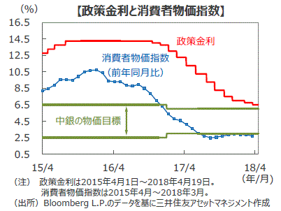 ■4月10日に発表された、18年3月の消費者物価指数は前年同月比+2.68%と、前月(同+2.84%)から小幅ながら低下しました。インフレ率は、引き続きブラジル中央銀行(中銀)の物価目標レンジ(+4.5%±1.5%)の下限を下回っており、極めて低水準で安定しています。