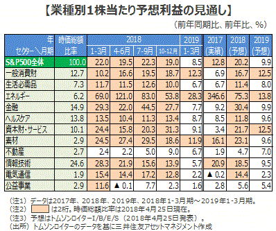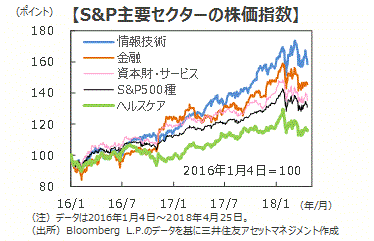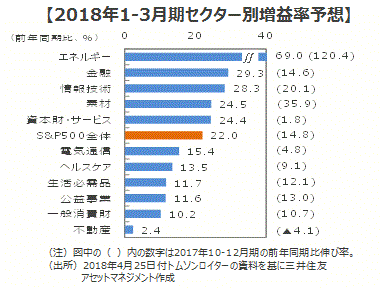 ■S&P500種採用企業の2018年1-3月期決算は前年同期比+22.0%(トムソンロイター集計4月25日発表)となる見通しです。2017年10-12月期(同+14.8%)から伸びが加速しました。セクター別に見ると、「資本財・サービス」が同+24.4%と前期(同+1.8%)から伸びが大幅に加速しました。また、「金融」が同+29.3%(前期同+14.6%)、「情報技術」が同+28.3%(前期同+20.1%)と、伸びを加速させました。
