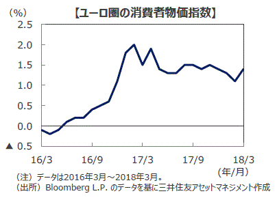 ■物価については、ユーロ圏の3月の消費者物価指数(HICP)は前年同月比+1.3%と、2月の同+1.1%から上昇しました。基調的なインフレ率はまだ弱いものの、景気拡大や賃金の上昇などによりインフレの下振れリスクは後退していると見られます。