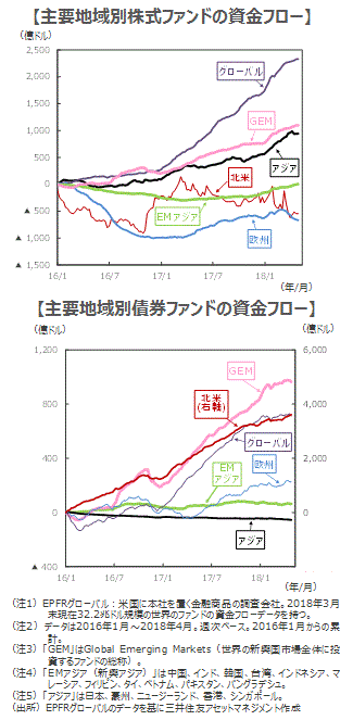 ■先進国の内訳を見ると「欧州」が▲122億ドルで2カ月連続、「北米」が▲24億ドルで3カ月連続で流出超となりました。「アジア(注5)」も▲5億ドルと、6カ月ぶりの流出超です。「グローバル」が辛うじて+61億ドルの流入超でした。