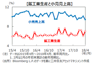 ■4月の鉱工業生産は前年同月比+7.0%と市場予想(同+6.4%)を大きく上回り、3月(同+6.0%)から伸び率が拡大しました。生産は輸出拡大や、半導体などのIT関連の高い伸びに支えられて、前月から上振れました。