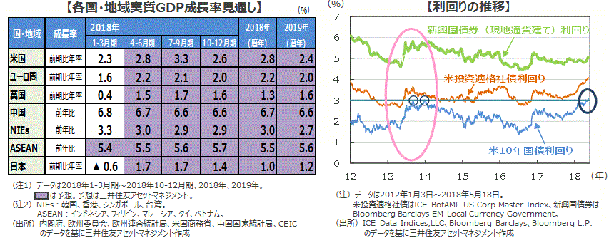 ■世界の金融市場は年初こそ堅調でしたが、その後は米長期金利の上昇、米国発の貿易摩擦の高まり、それらを嫌気した株式市場の調整や新興国市場からの資金流出と、波乱含みの展開となっています。また、経済も、日本の1-3月期実質GDPが前期比で9四半期ぶりにマイナス成長になった他、米欧でも景気の減速が見られました。
