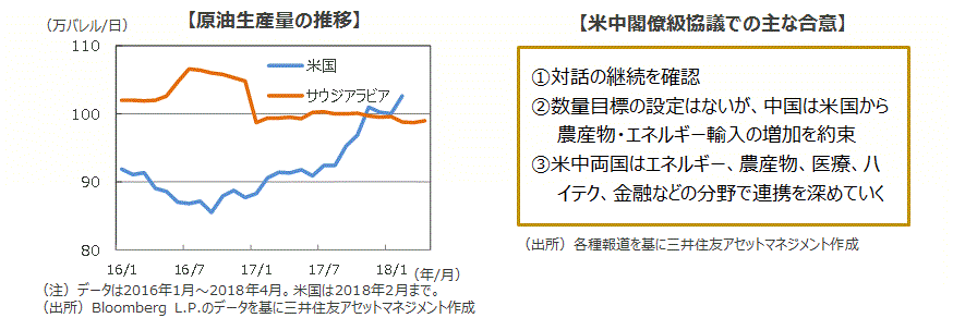 ■足元の原油価格は、①主要産油国による協調減産、②好調な景気拡大に伴う需要の増加、③米政権によるイラン制裁再開の可能性、が背景です。米政権によるイラン制裁が再開され、イランからの原油供給が減少しても、サウジアラビアや米シェールオイルの増産などで補うことが可能と見られるため、持続的に原油が上昇する可能性は低いと見込まれます。