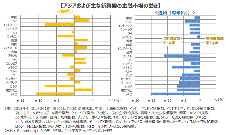 ■ところが、今年の4月以降、新興国市場は経常収支が赤字の国やインフレ率が高い国を中心に、通貨や株式、債券などの下落に見舞われています。