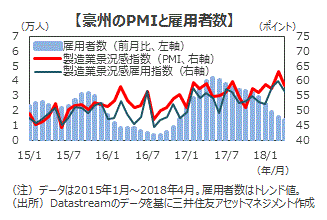 ■2018年4月の製造業景況感指数(PMI)は、58.3となりました。過去最高だった3月の63.1からは低下したものの、高い水準を維持しています。