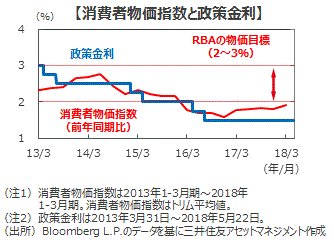 ■18年1-3月期の消費者物価指数(異常値をつけた項目を除外したトリム平均値)上昇率は、前年同期比+1.9%と、豪州準備銀行(RBA)の目標レンジ+2~+3%を引き続き下回りました。