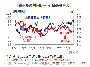 ■足元の豪ドルの対円相場は、緩やかに持ち直しつつあります。シリア情勢等の地政学リスクの後退、米中貿易摩擦の緩和等によるものです。中東情勢には引き続き注意が必要ですが、堅調な豪州景気、豪日間の金利差拡大等から判断する限り、豪ドル相場は今後も底堅い推移が見込まれます。