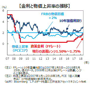 ■景気、雇用の順調な拡大を背景に、6月12日、13日に開催される次回の米連邦公開市場委員会(FOMC)では、0.25%の利上げが決定される公算が大きいと考えられます。その後も拡張的な財政政策に支えられて、米景気が拡大を続けると予想されるなか、FRBは利上げを継続すると見られます。