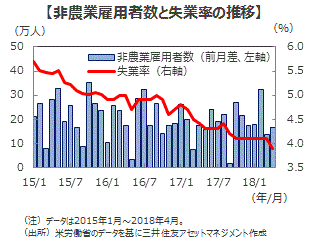 ■米国の労働市場は堅調に推移しています。2018年4月の非農業雇用者数は前月に比べ+16.4万人増となりました。3カ月移動平均では同+20.8万人と、月平均+20万人超の増加ペースを維持しています。一方、失業率は3.9%でした。2000年12月以来の4%割れです。