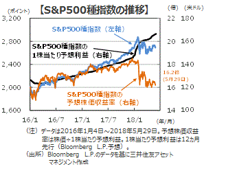 ■トムソン・ロイター(5月29日)によれば、S&P500採用企業の2018年予想増益率は前年比+22.0%と、4月末時点(同+20.2%)よりも上振れました。特にエネルギーセクターは4月の同+75.3%から5月は同+90.8%と大きく上振れました。他には、情報技術セクター(同+18.5%⇒同+21.6%)と一般消費財セクター(同+16.7%⇒同+19.4%)の上方修正が目立ちました。