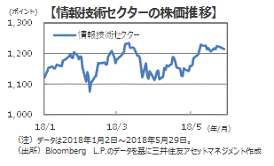 ■こうした中、年初から5月29日までの騰落率を見ると、S&P500種指数が+0.61%であるのに対して、情報技術セクターは同+9.8%と、セクター別では最も高い上昇率となっています。情報技術セクターは3月12日の史上最高値(1,233.97)近くまで値を戻していますが、上値を更新するには至っていません。