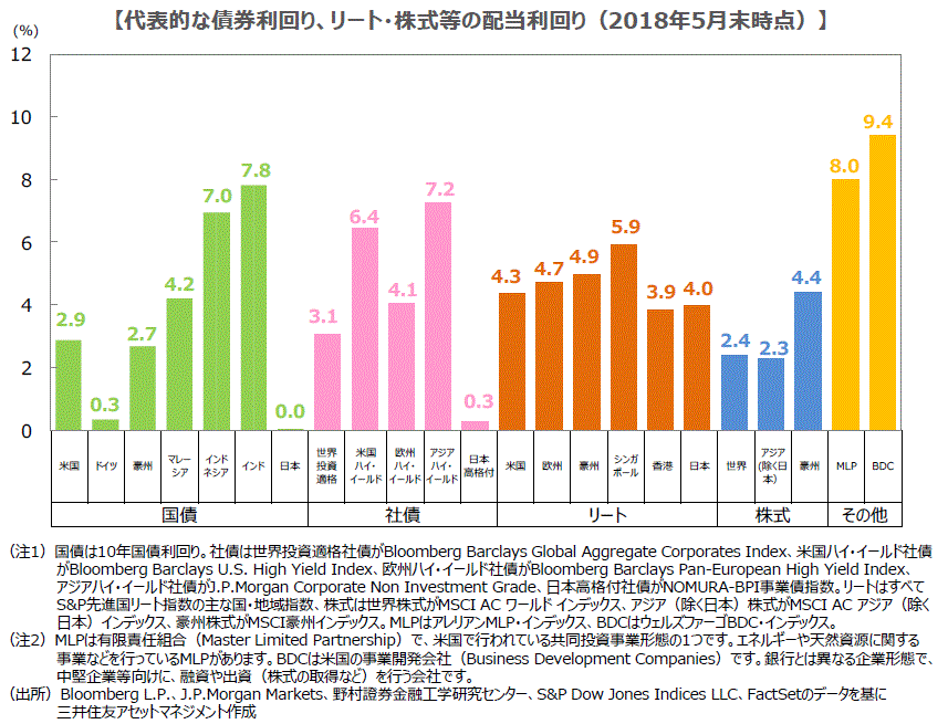 ■5月は、先進国の国債利回りが前月比(以下同様)で低下する一方、新興国市場全般の下落の影響を受けてアジアの国債利回りが小幅ながら上昇しました。社債は日本以外上昇しました。リートの配当利回りはまちまちの動きとなりました。欧州、シンガポールは上昇しましたが、米国、豪州は低下、香港、日本は変わらずでした。株式はほぼ変わらずでした。その他の資産はMLP、BDCともに2カ月連続で低下しました。原油価格の上昇などが好材料となった模様です。