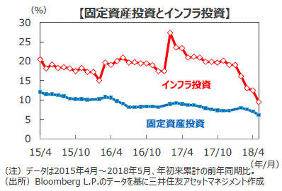 ■内訳をみると、インフラ投資が同+9.4%と、1~4月(同+12.4%)から減速し、2桁を割り込みました。地方政府の債務抑制に伴いインフラ投資の伸びが鈍化したとみられます。