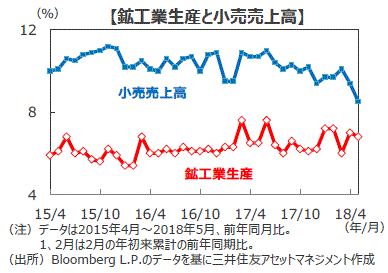 ■以上の通り、5月の主要経済指標は、市場予想を下回りました。中国政府が進める供給サイドの構造改革や金融システムリスク抑制の影響とみられます。ただし、5月の小売売上高は、祝日日数の関係で下振れした模様で、6月は上振れる見込みです。また、7月以降は輸入関税引き下げを通じて上向くとみられます。