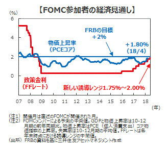 ■6月12日~13日に開催された米連邦公開市場委員会(FOMC)は、市場の予想通り、政策金利(FFレート)の誘導レンジを0.25%引き上げ、1.75%~2.00%とすることを決定しました。全会一致の決定です。