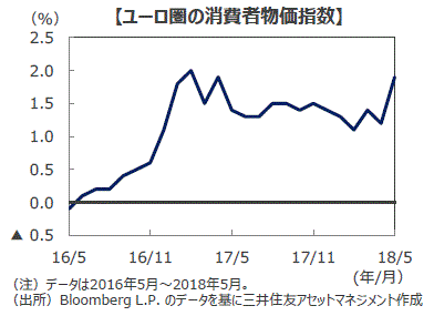 ■ユーロ圏の5月の消費者物価指数(HICP)は前年同月比+1.9%と、原油価格や賃金上昇の影響などから、4月の同+1.2%から大きく上昇しました。ECBは物価について、中長期的にはECBの目標とする2%以下かつ2%近傍に近づくと見ています。