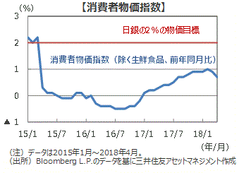 ■物価認識については、現状について「消費者物価(除く生鮮食品)の前年比は、0%台後半となっている」とし、従来の1%程度から認識を引き下げました。ただし、これは足元の消費者物価(除く生鮮食品)の伸びが4月に前年比+0.7%へと鈍化していることを追認したものです。先行きについては「2%に向けて上昇率を高めていくと考えられる」と変更はありませんでした。