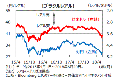 ■中銀の金融政策現状維持を受け、通貨レアルは20日、対米ドルで1ドル=3.77レアル台で引けました。レアルはトラック運転手のストライキなどが嫌気され、一時3.9レアル台に下落しましたが、中銀による通貨スワップを用いた為替介入を受けてやや反発しています。しかしながら、米利上げ見通しが今年3回から4回に変わり、ドル高に伴う新興国からの資本流出圧力がかかるなか、大統領選挙を今年の10月に控えた政局の不透明感も逆風となることから、レアルは当面上値の重い展開となりそうです。