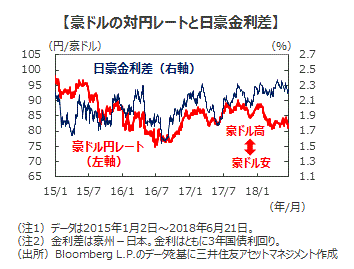 ■足元の豪ドルの対円相場は、揉み合いの展開となっていますが、豪州の景気が堅調に推移していることや、基調として豪日間の金利差が広がりつつあること等を踏まえると、豪ドル相場は今後、底堅い推移が見込まれます。