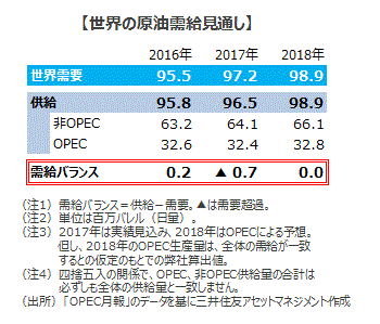 ■世界の原油需給は引き締まってきました。世界的な景気拡大により需要が拡大しているうえ、OPECおよび非OPEC主要産油国による協調減産の効果により、供給増加の勢いが鈍ってきたためです。