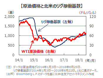■需給の改善を支えに、北米の代表的な原油価格であるWTI価格は、2018年2月初旬の1バレル当たり59ドル台を当面の底に緩やかな上昇基調にあります。米国の対イラン経済制裁発動に伴い供給が一段と細るとの観測が浮上してきたこともあり、原油価格は、同70ドル前後で推移しています。
