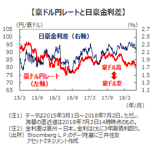 ■米国の通商政策には注意を払っておく必要がありますが、豪州の堅調な景気の拡大や、日豪間の金融政策の方向性の違い(日銀は金融緩和姿勢維持、RBAは中立姿勢を維持)等を踏まえると、豪ドルは今後、持ち直すと予想されます。