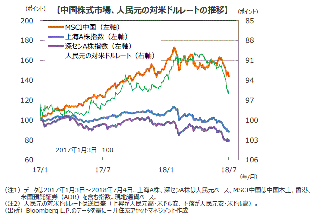 ■人民元が、6月中旬から足元にかけて大きく下落しています。合わせて中国株式市場も調整幅が拡大しています。人民元は、米国が利上げを決定した6月13日の6.39元/米ドルから、米国が中国に対して制裁関税リストを公表した6月15日に6.44元/米ドルに下落し、7月2日には6.69元/米ドルまで下落、約11カ月ぶりの安値を記録しました。人民元の大幅下落は、(1)6月24日に発表された中国人民銀行(中央銀行)による預金準備率の引き下げ(実施は7月5日)に、(2)米国との貿易摩擦の拡大による輸出減と中国景気の停滞懸念、などが重なったことが要因と考えられます。