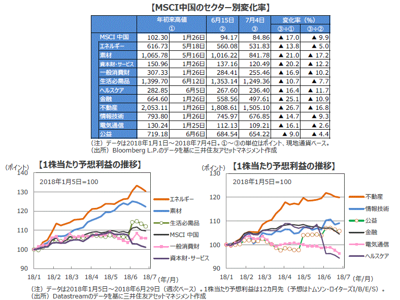 米国の保護主義的な通商政策により、資本財・サービスセクターや一般消費財セクターなどがマイナスの影響を受けると思われます。一方情報技術セクターは、モメンタムは低下しているものの、増益基調が持続する見通しです。中国経済は安定した成長が続く見通しで、MSCI中国の企業業績見通しは、2018年が前年比+22.2%、2019年が同+15.9%、2020年が同+15.4%(いずれもブルームバーグ集計)と、2020年まで2桁の利益成長が持続する見通しです。