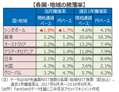 ■18年6月のアジア・オセアニアのリート市場を現地通貨ベースでみると、まちまちの動きとなりました。